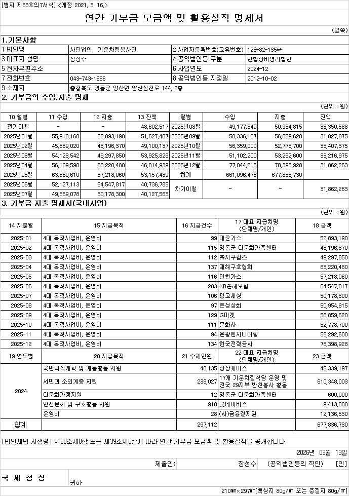 2025년 연간 기부금모금액 및 활용실적 명세서